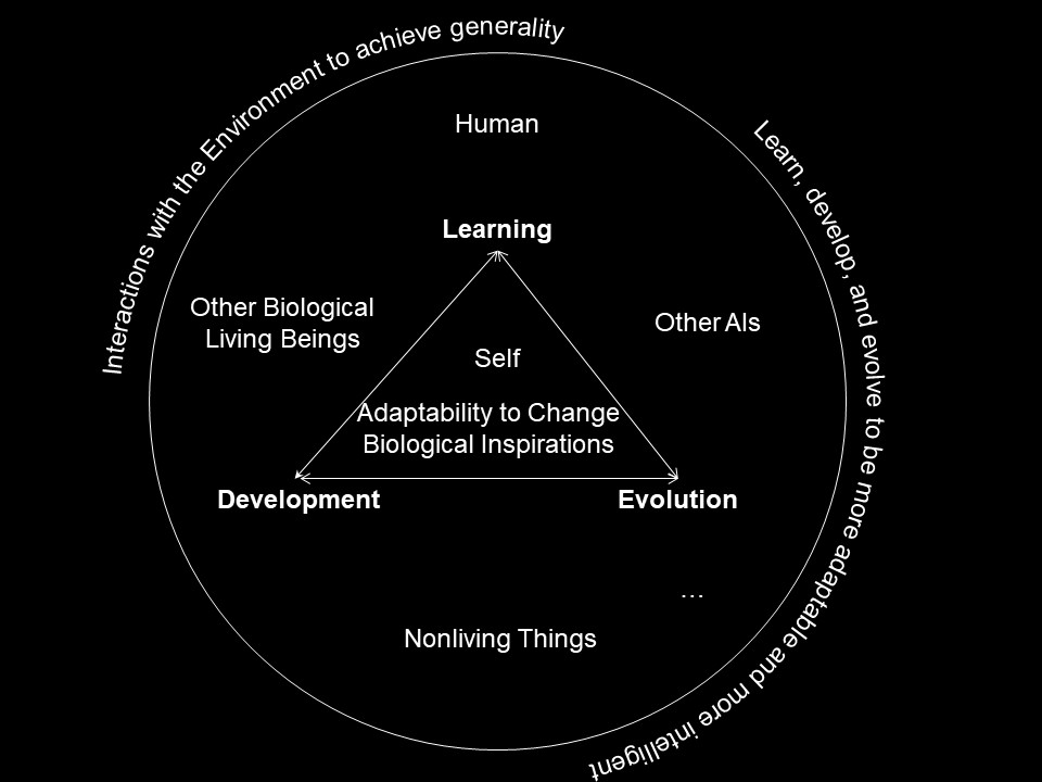 | The way AIs achieve their intelligence and generality is even more important than how general and intelligent the AIs are. The upper picture set a initial framework to achieve biologically-inspired Artificial General Intelligence. |